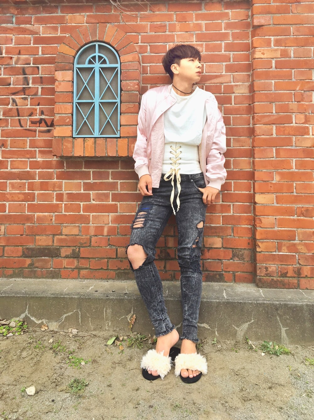 ピンク系のブルゾンを着用したメンズの夏コーディネートの1枚目の写真