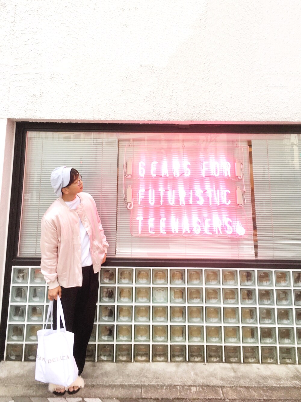 ピンクのネオンとピンクのスカジャン。 キャスケットにメガネ。 詳しくは、Instagram→9.11.21