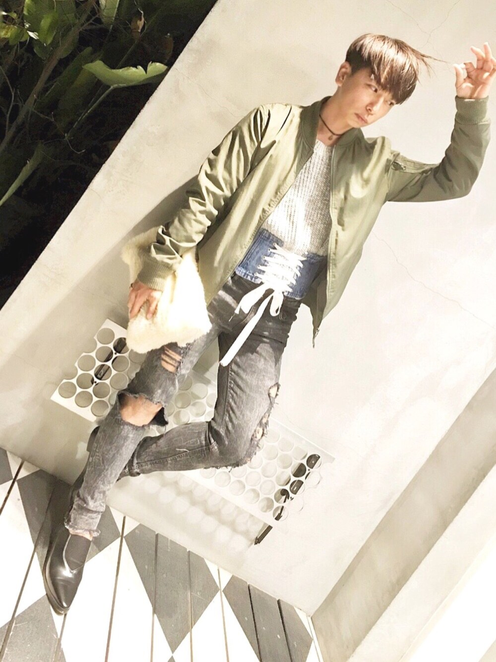 ブラック系のその他パンツを着用したメンズの春コーディネートの1枚目の写真
