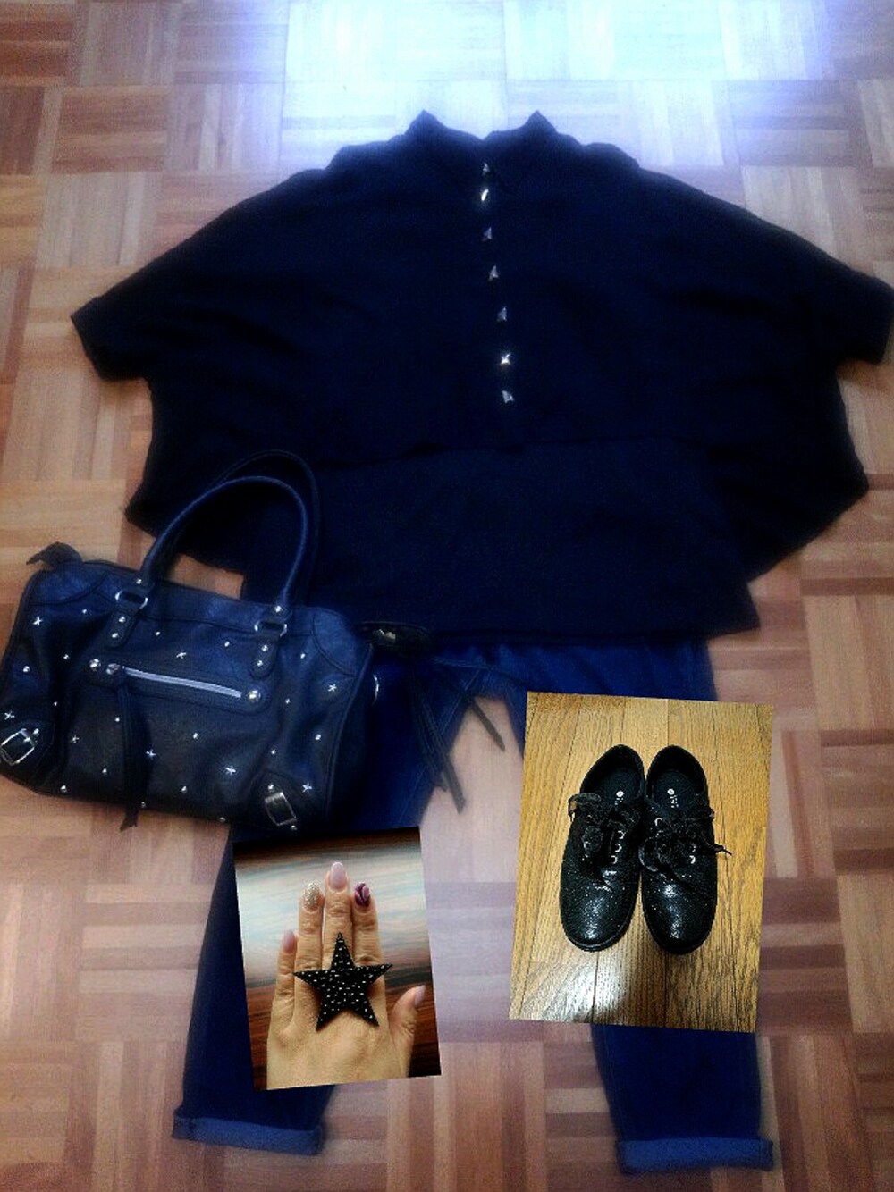 ブラック系のシャツ/ブラウス、ブラック系のスニーカー、ブルー系のデニムパンツを着用したレディースの夏コーディネートの1枚目の写真