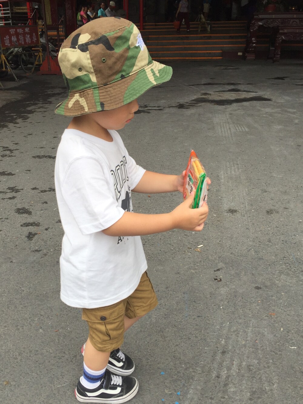 ホワイト系のTシャツ/カットソー、ブラック系のシューズ、グリーン系の帽子を着用したキッズの夏コーディネートの1枚目の写真