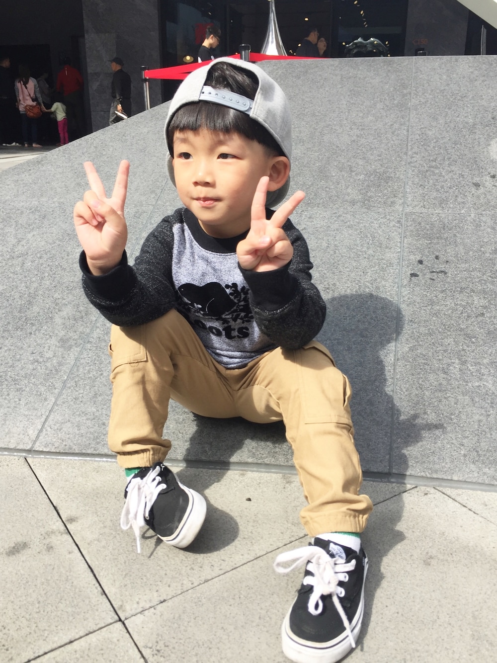 ブラック系のTシャツ/カットソー、グレー系の帽子を着用したキッズの冬コーディネートの1枚目の写真