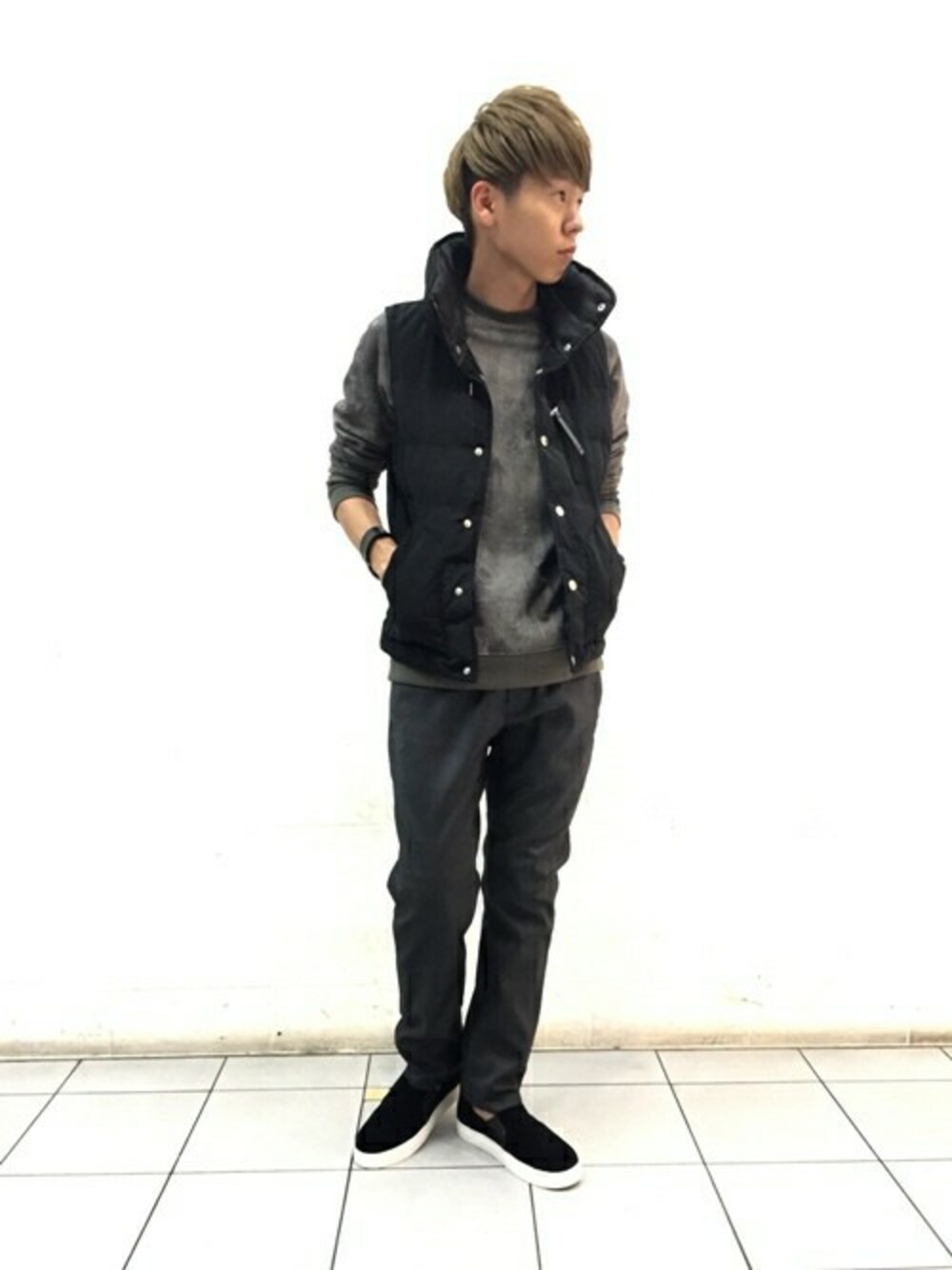 ダウンベストにスラックスを合わせたきれいめカジュアルスタイル。 全体をモノトーンにまとめることで大人感を演出。 ダウンベストの最大のポイントはボリュームネックであり、衿を少し開けた際のバランスが◎。 秋冬コーデに真っ先に手に入れたいアイテム。