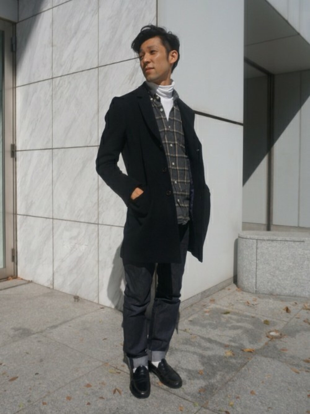 ウールのチェスターをカジュアルに着こなすスタイルがが今年風。白タートルをワンポイントに使用。