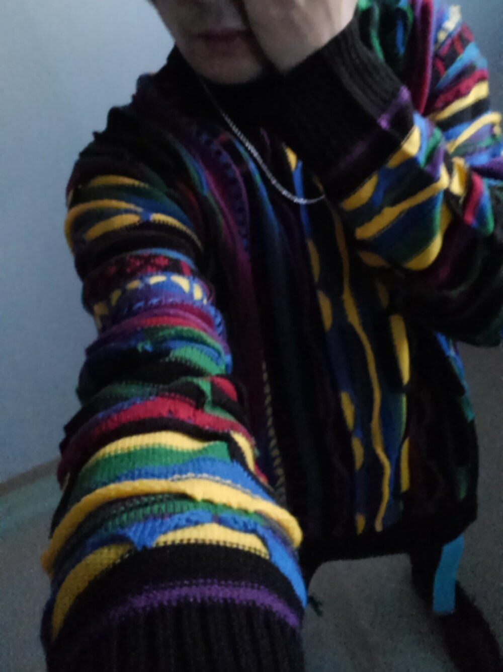 パンチのきいたセーター購入! 下はいつもの黒一色。 冒険したいけど、いいのわかない😵 この時期のコーデは難しいなー😵