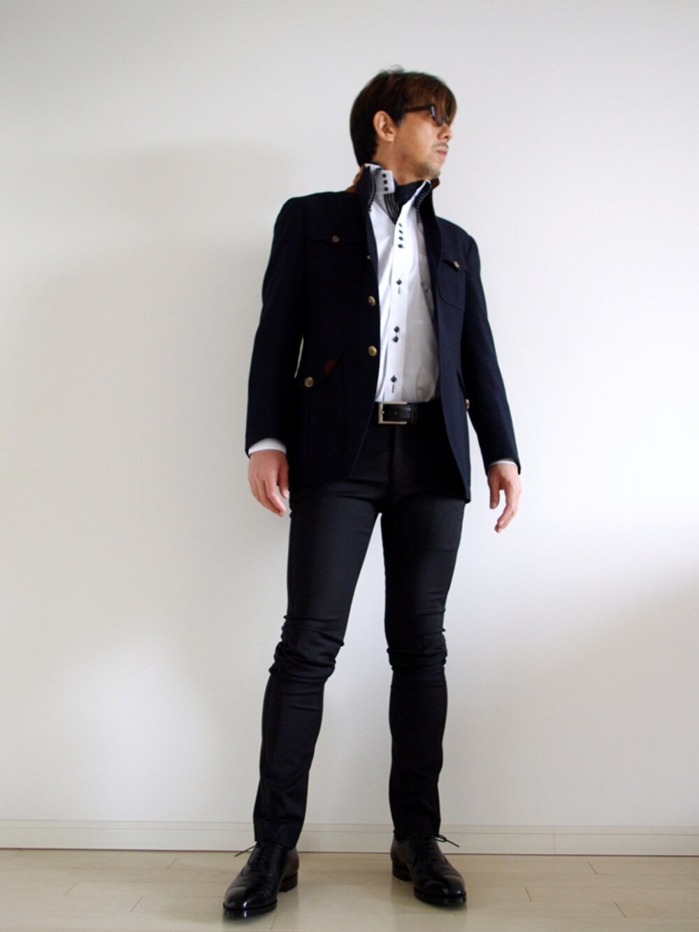 ネイビーのチンストラップ付きサファリジャケットは麻布テーラーでイージーオーダーした干場モデル。 デコシャツはパーフェクトスーツファクトリー。 胸元にはOLD VILLAGE HALLのストールを差しています。 ドレスパンツは当ブログ初登場のZARA MAN。 ドレスシューズはクロケット&ジョーンズのハラス。 以上、同窓会のパーティー用にセットUPしてみました。
