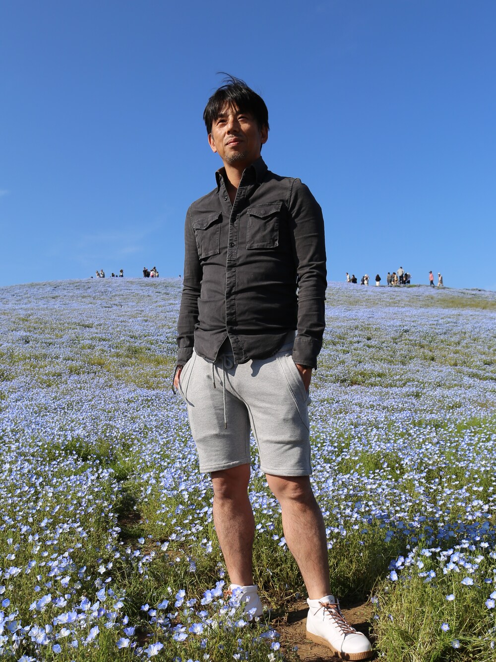 ボタンダウンシャツにスウェットショーツを合わせ初夏らしく。