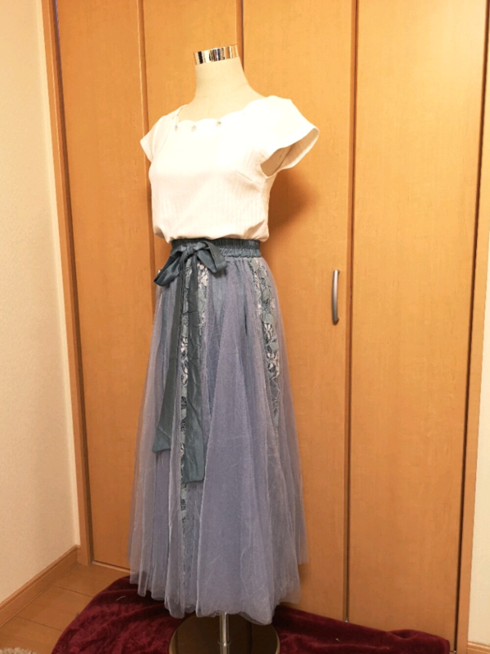 くすみブルーのチュールスカート♡ レース切り替えになってて可愛い♡
