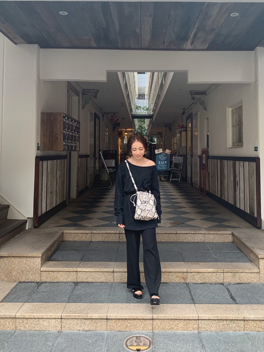 黒のワントーンコーデのポイントにパイソン柄のバッグを。