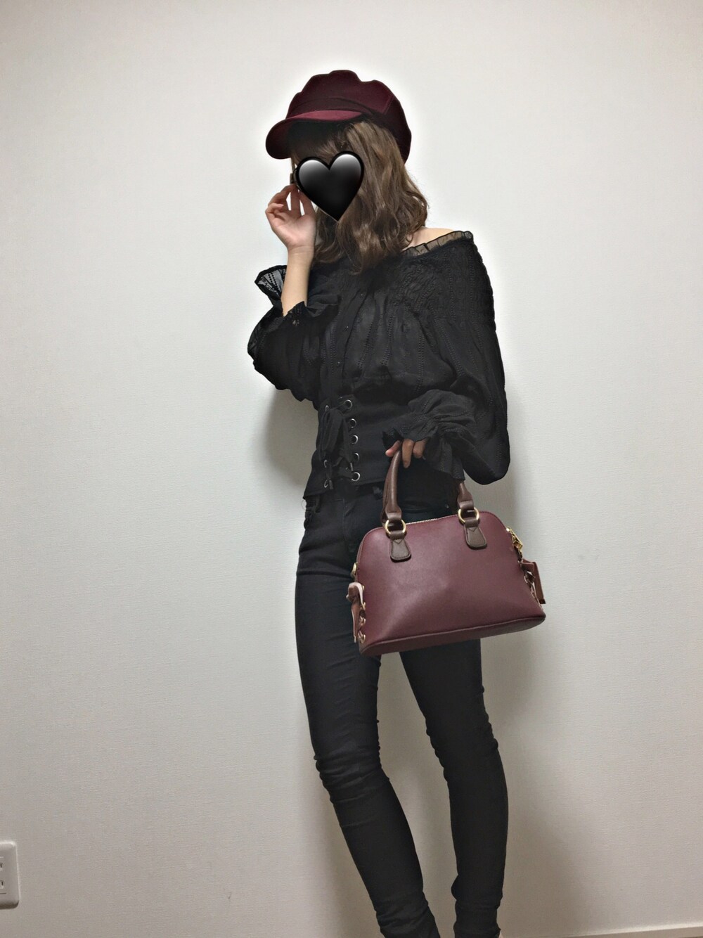 スキニー履いたの小学生ぶり、、🙈🙈 かっこいい色あいのリップを買って早速使いたかったので 服装を黒で統一して 帽子とバッグをリップの色に合わせました✌🏻💋 上に流行りのもこもこベスト着てたけど ブラウスお気に入りなので 写真用に形と柄を綺麗に写すために脱ぎました🗣🗣 モテを意識してないかっこよいスタイル🤤笑