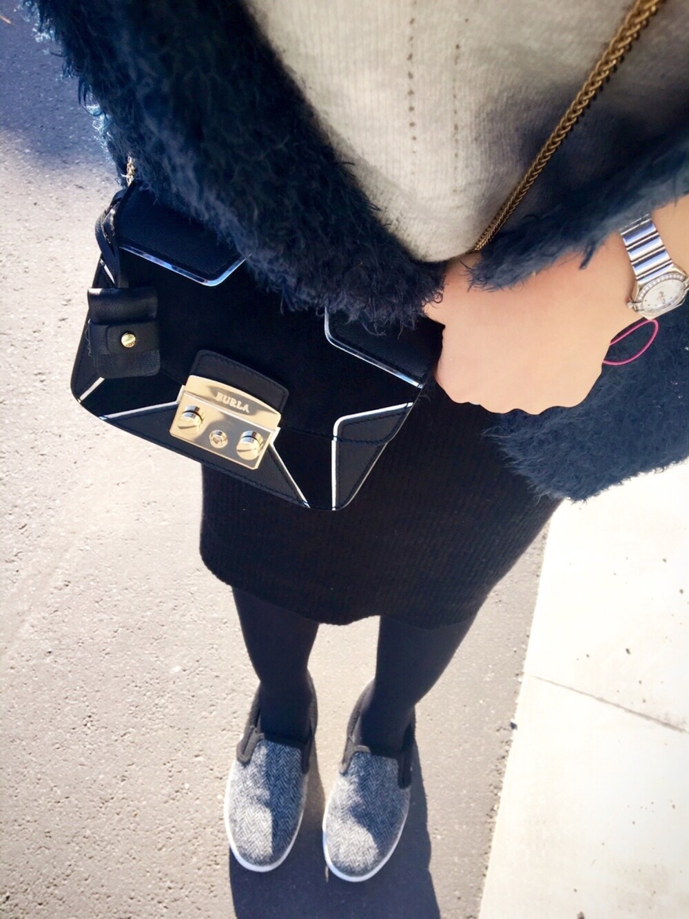 ★★STAR★★ バッグが主役👑 おニューのフルラのメトロポリス プチプラで我慢しようと思ったけど、あえての★レザー×スエードでかわいすぎる あとはシンプルめに 楽ちんなドッキングワンピ