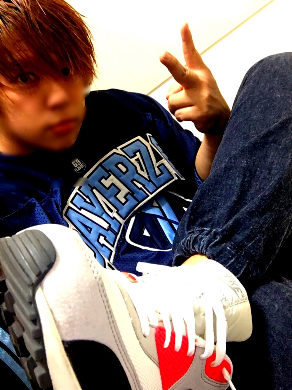 playerz69のフットボールシャツとタイトめなデニム調ジョガーパンツに 靴はNIKEのエアーマックスでスポーティなコーデにしました〜😊💨