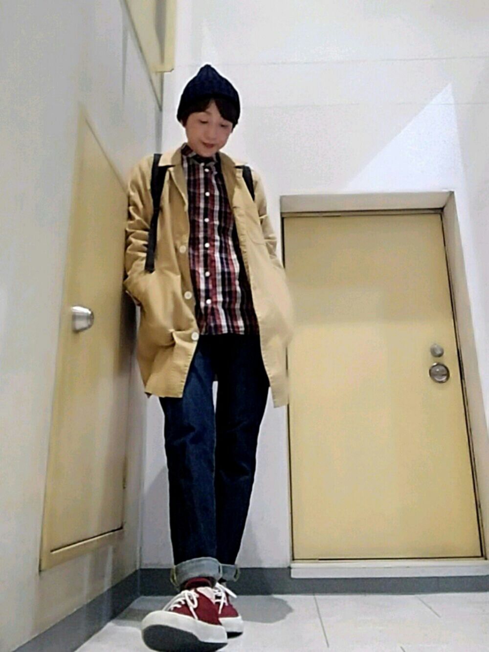 こんにちは☺ ベージュ×ネイビー×小豆色 気温が24、25℃ぐらいあるらしい ので ちびエリシャツにペラペラのステンカラー コート 春先のコーデなってしまった… 扉と同化してる❗ いつも見てくださりありがとうございます。 感謝いたします。☺🍀