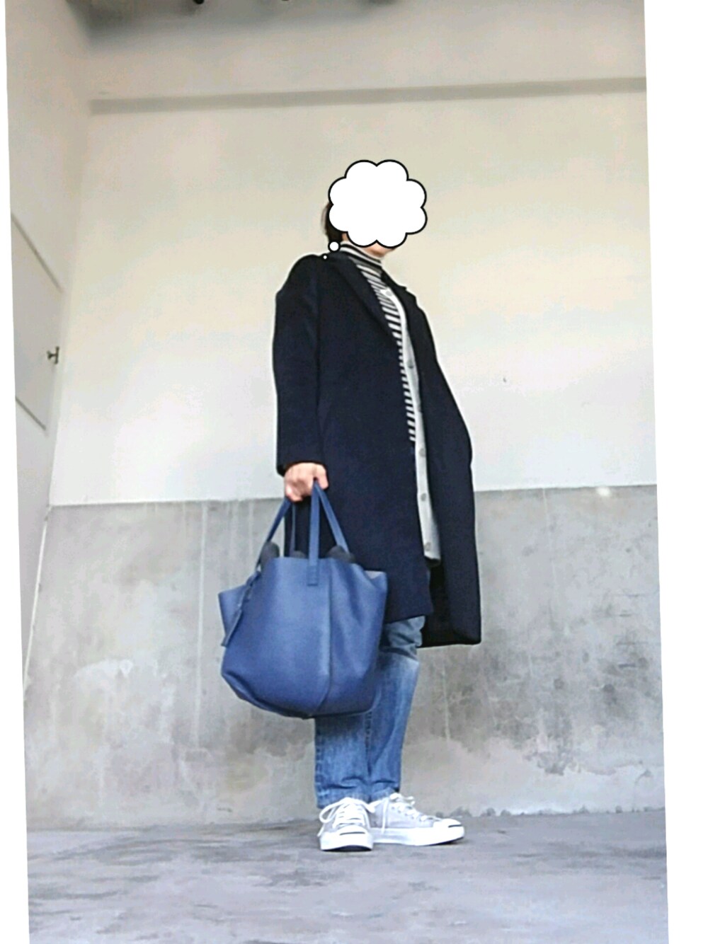 おはようございます。 無印のボーダータートル 濃紺シンプルなチェスターコート バックも青系にしました。 いつも見ていただきありがとうございます。
