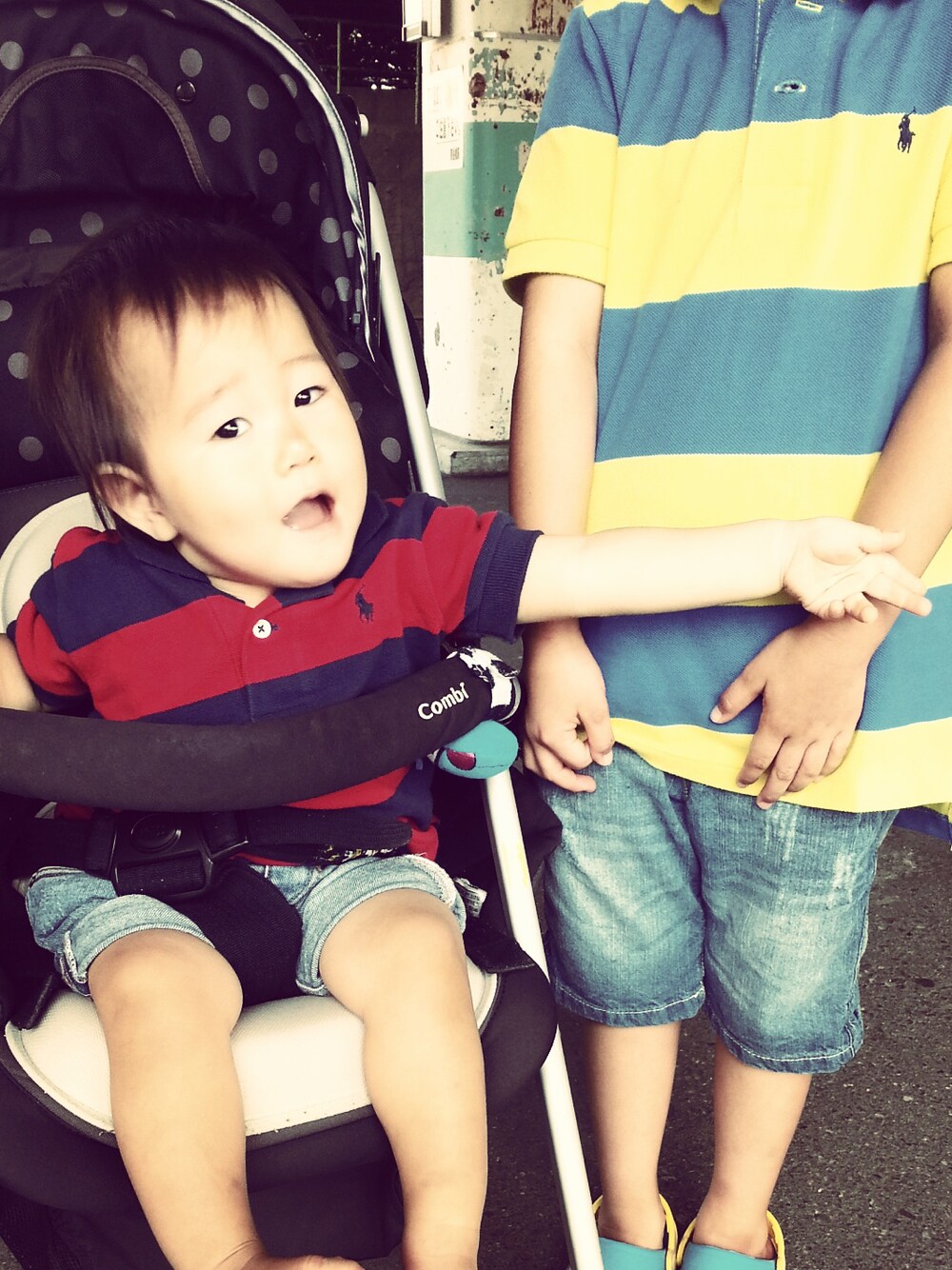 ベビーカーですみません… 駅のホームですみません… 東京のおばあちゃんちへ。 電車は空調がきいてるからとポロシャツを着せたら、最近はあまりきいてないのかなぁ?長男に暑いよーとクレームいただきました(^^;
