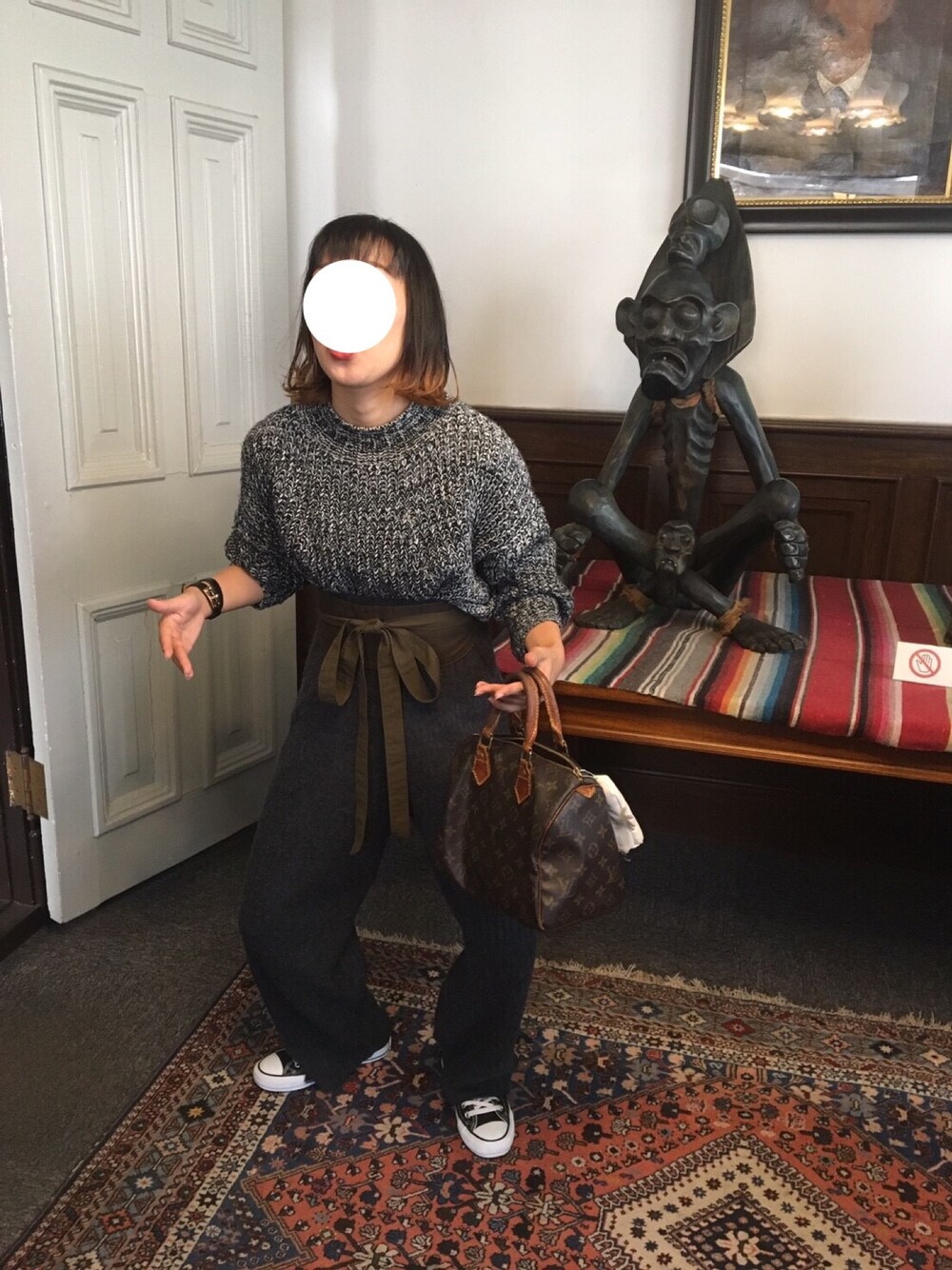 *** 今日のコーデ (笑) 変なポーズをしてるのは お気になさらずに😊 サッシュベルトに上下ニットコーデ グリーンのニットパンツがお気に入りです。150㎝の低身長の私にはこのパンツは丈が長いので、サッシュベルトでとめてちょうど良いくらい。 ***