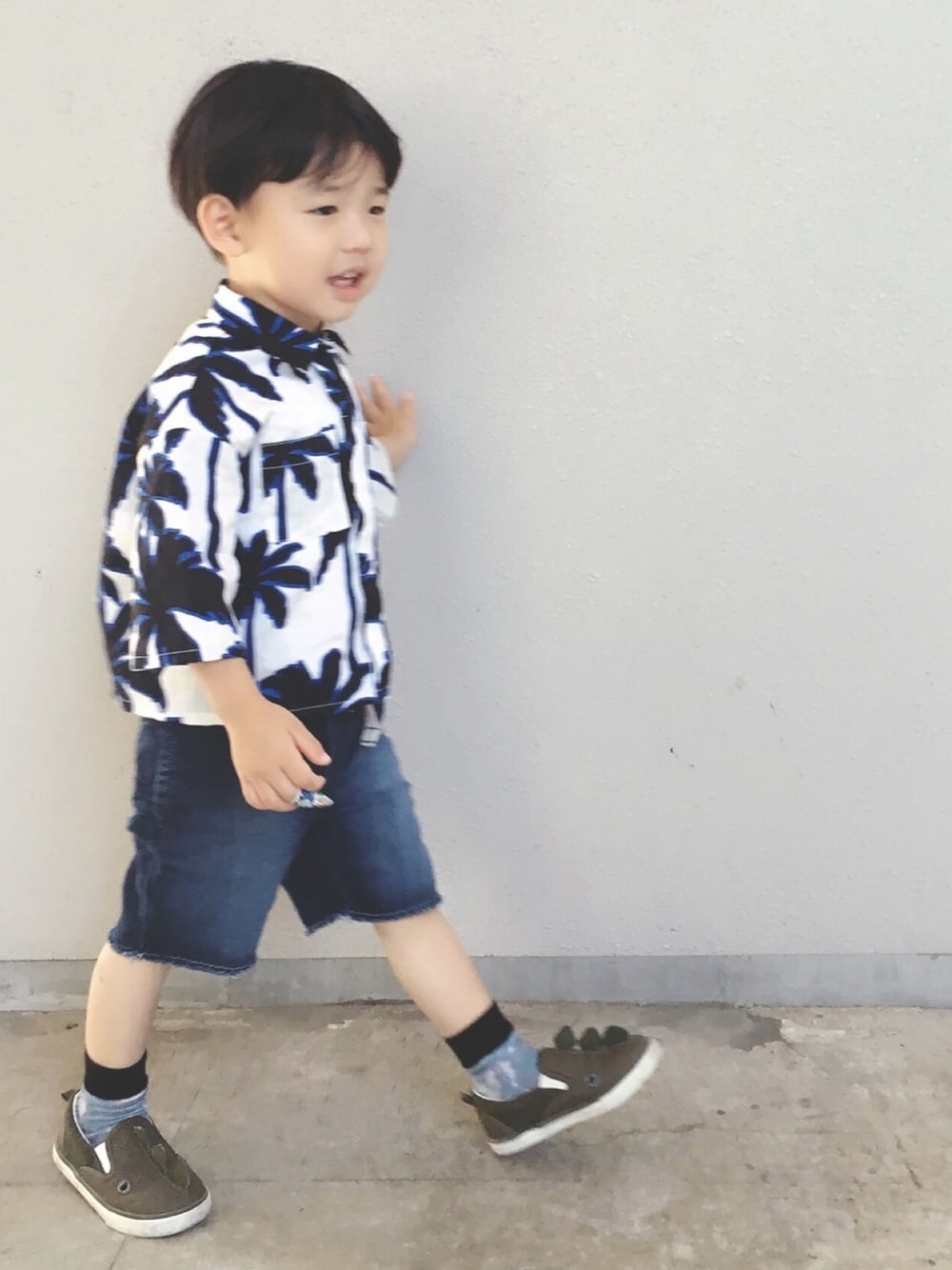 切りっぱなしのハーフパンツがかわいい 大好きな恐竜スニーカーと合わせて 早くお出かけしたくて怪獣になりかけてる💦