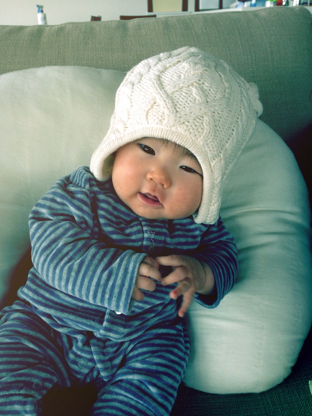 お姉ちゃんのお下がりのニット帽〜 耳のところの三つ編みを取ってしまったら、 男の子でもいける^_^