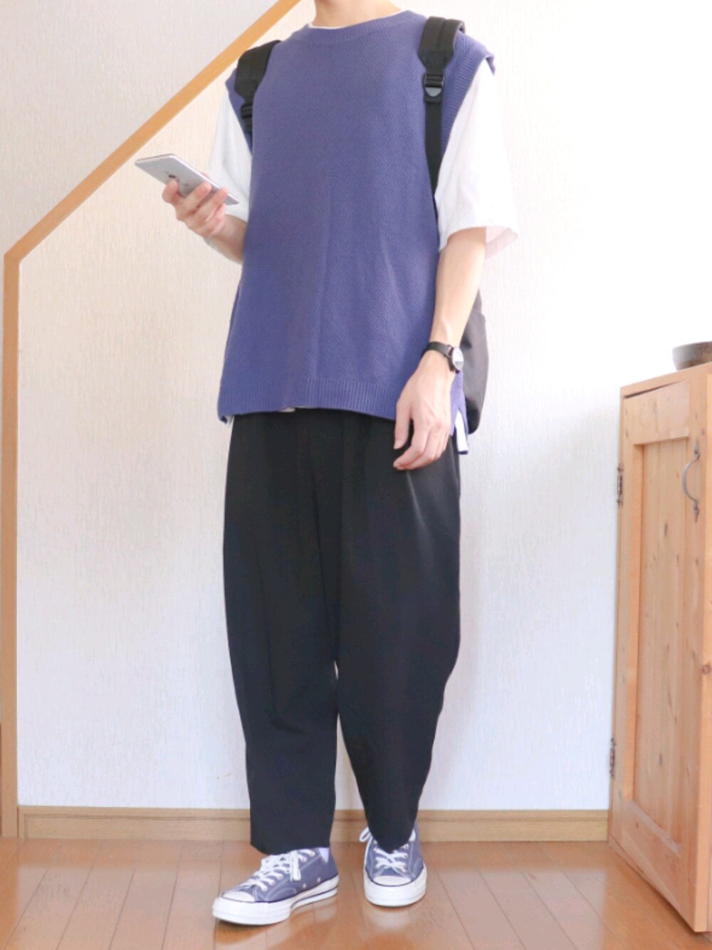 みなさんこんにちは~ いつも見ていただきありがとうございます🙏 今日はリュックスタイル このニットベストの色合いが好きなんですよ~ CONVERSEとも相まって良い感じ◎ Instagramにも良ければのぞきにきてください~ [@hide_2160]