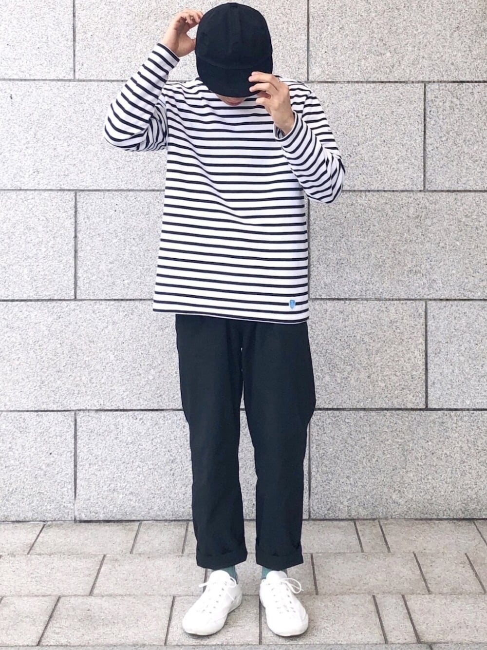 ボーダーTに黒のゆったりしたパンツという平凡コーデに、キャップとミントカラーのソックスで遊び心を 気に入っていただけたらお気に入り追加していただけると嬉しいです😊