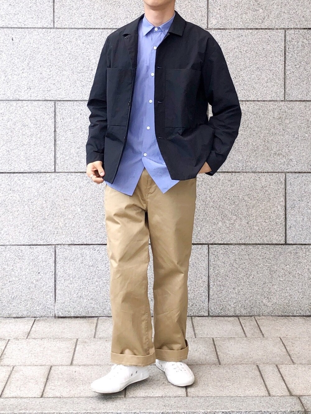 ベーシックなワイドのチノパン、そしてブルーのシャツ、色が明るすぎると感じたのでアウターには大きなポケットによって少しワーク感のあるナイロンカバーオールを。 ネイビーのアウターは案外どんなインナーやボトムに合わせても大人っぽく、締まった印象になるので重宝します🧚♂️ 動きやすさも重視したお花見コーデです🌸