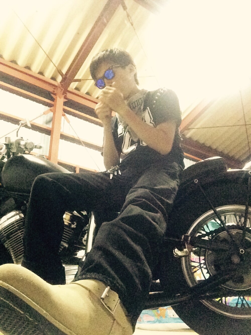 バイクコーデ第二弾‼︎ ホントに乗る時はこんな感じになりますよ。前にTシャツ、ショーツで乗ってたら軽く見知らぬバイカーに説教をくらったのでブーツとデニムにしました♫これで転けても大丈夫♫ww ホントは友人がすね毛を剃った事を書きたかったのだけど、男のすね毛の行方を書いても誰も得しないからやめます( ̄▽ ̄)‼︎