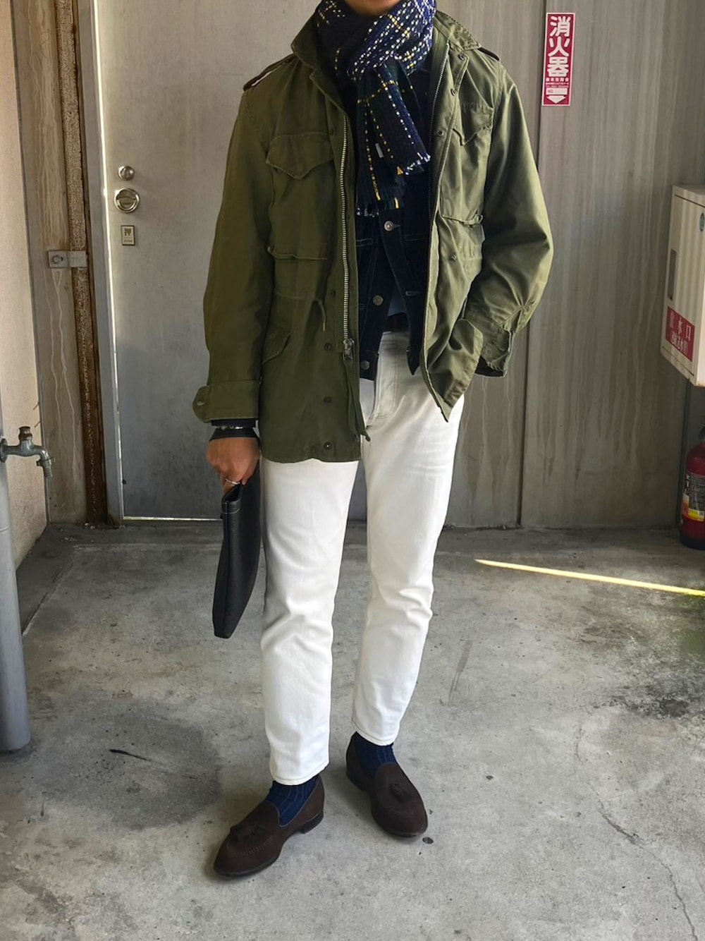 アメリカ古着を中心にイタリアンな丈感の着こなし。 最近流行りのミリタリーミックスで 綺麗すぎず決めすぎず。