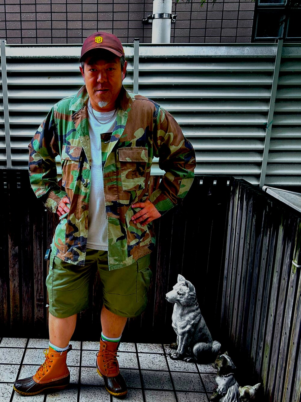 アウトドアーとミリタリーな48歳おじさんのキャップ「【別注/WEB限定】<NEW ERA>GLR 9TWENTY UP SIDE DOWN キャップ」を使ったコーディネート