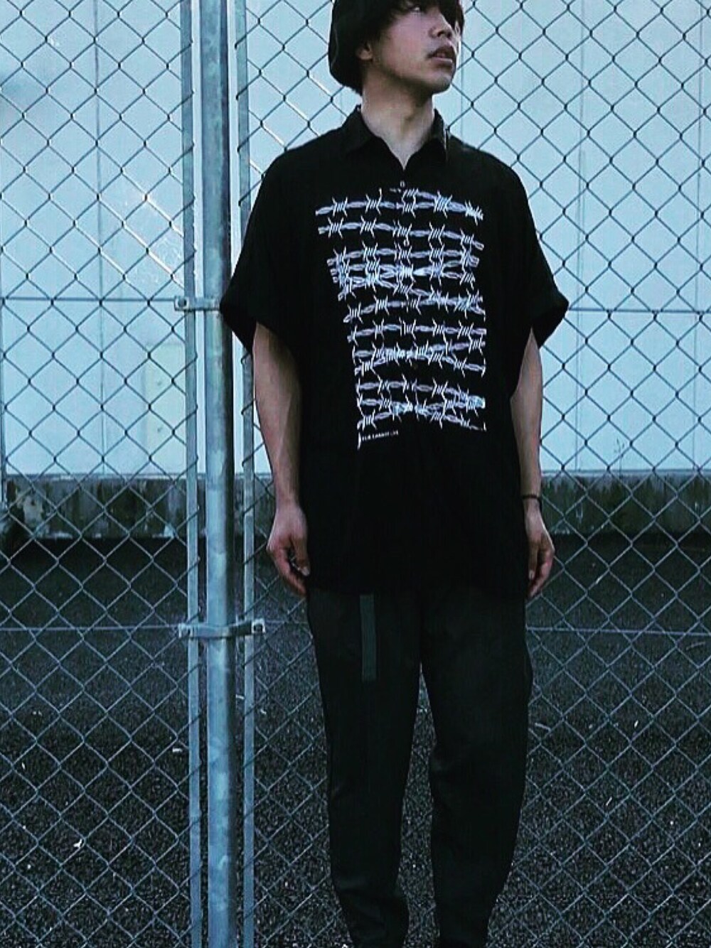 久々の投稿です! SHAREEFの wire shirts を網をbackに撮影! ドルマン仕様でとても着心地がよくデザインも最高です😊
