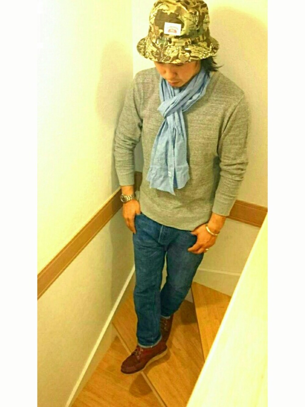 デニムタグってことでパンツが主役になるようにシンプルコーデです☆orslowのデニムはあえてワンサイズ大きめにして腰穿きしてます☆色とサイズ感がすごく気に入ってます♪♪BARNSのストールもコテコテのアメカジにならないよう外しに使えて凄く便利です♪♪