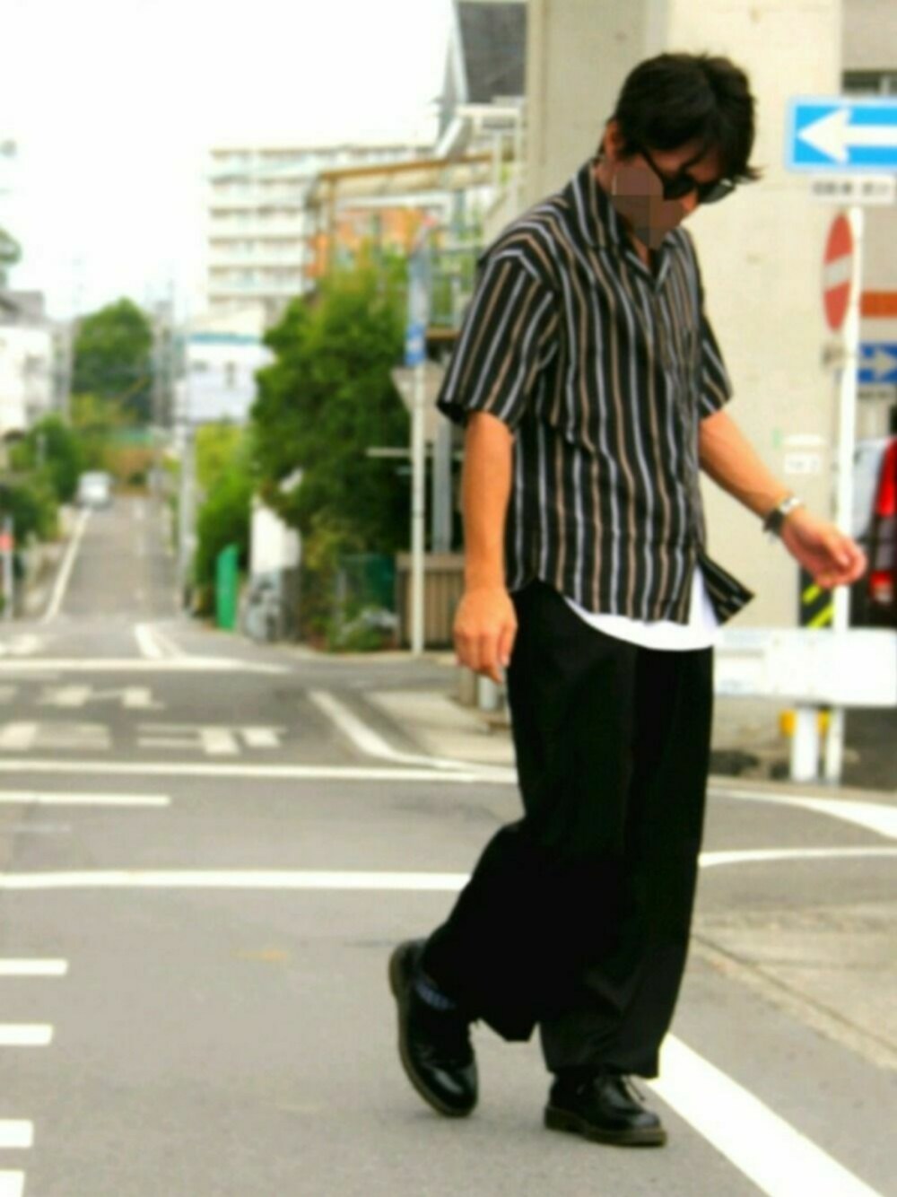 ⭐ストライプシャツにブラックワイドパンツの男らしいコーデ⭐ いつもいいね👍フォローありがとうごさいます🤣 リドムのストライプシャツ 白のタンクトップをレイヤードにちょい見せ バリバリに太いスラックスをしっかりとウエストで履き、丈を短めに見せています。 靴は大好きなマーチンの短靴を選びました‼️ 黒のワントーンにアクセントとしてレイヤードで白色を入れることによって少しだけカジュアルに見せています😁 黒のストライプに太いスラックスだけだとガラの悪い人に見えてしまいますしね✨ 最近のお気に入りのBEAMSのサングラスはあまり見かけない丸型😎 他とは違うアイテムを1つだけでもいいのでコーデに取り入れると、いわゆる量産型にはならないですよね👍 秋なり、涼しくなってきます。ファッションに気を配りたい季節なので、無理なく、らしさ、を出していきまーす‼️