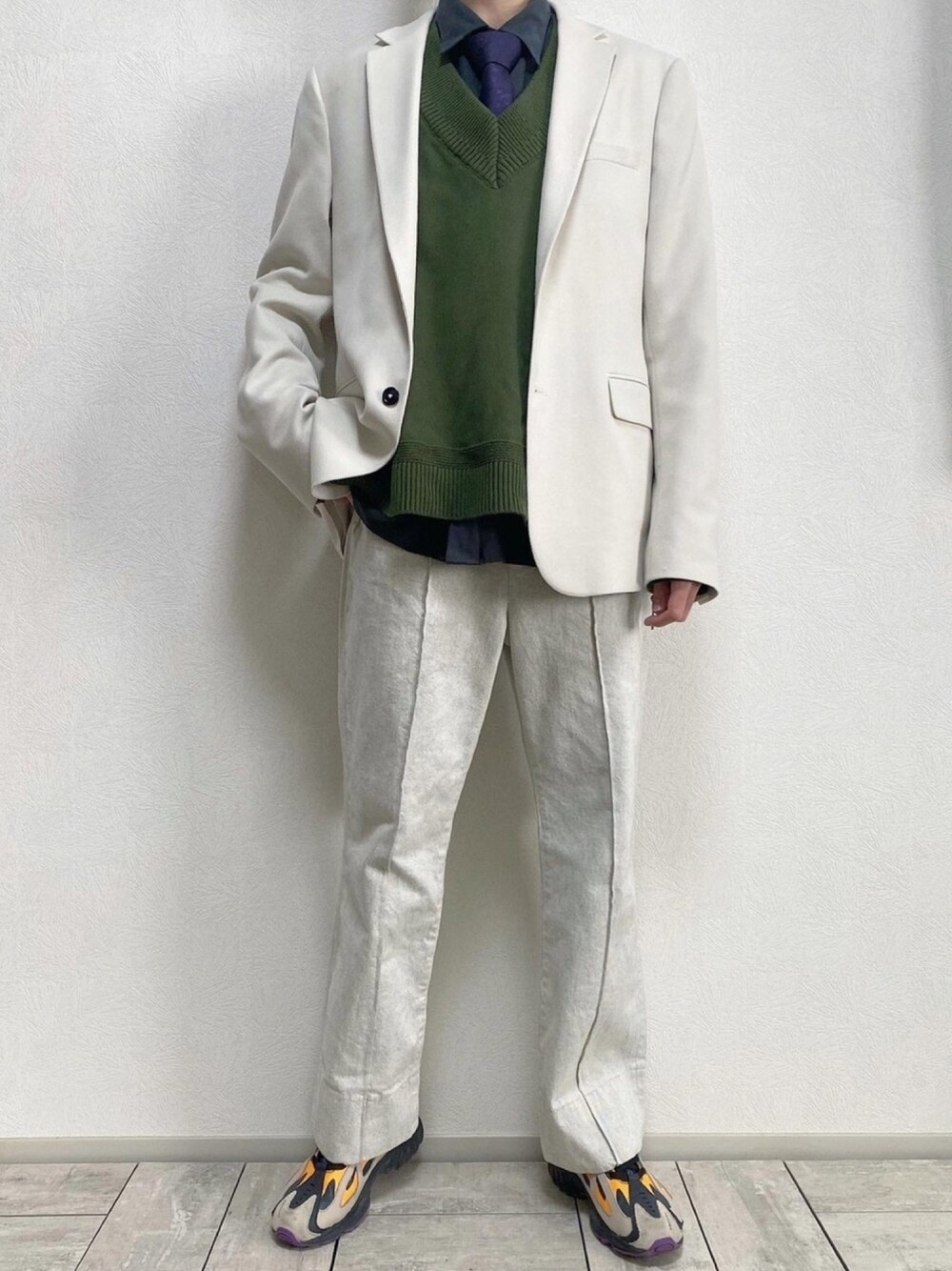 白セットアップ風コーデ🎍 ネクタイを主役にしてそこから枠組みを構成しました。スニーカーは落しとして、かっちりしすぎないデニムパンツでジャケットのかっちりさを和らげています🎍