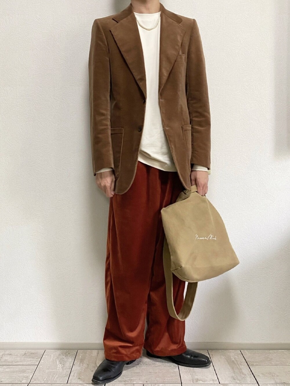おはようございます☀ 今日は日曜日!ということでピクニックへ行きたい気分だけど行きません!!! ベロアパンツとジャケットで少し古臭いけど男らしい感じが色に漂うコーデとなっておりますこれこそ甘辛ミックス よかったら毎日投稿しているので是非是非フォローお待ちしております!!