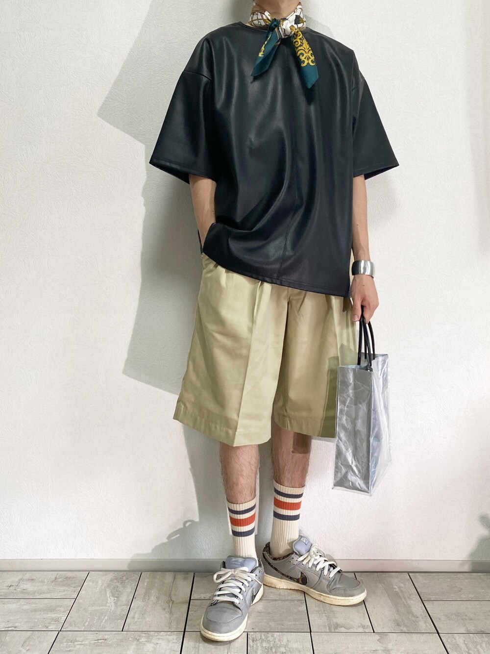 おはよう御座います☀️ 【テーマ】夏にしたい大人カジュアルコーデ きれいめなレザーカットソーとセンタープレスの入った綺麗目なハーフパンツ、そしてカジュアルストリートとのソックス&スニーカーで落とす 型的には一般的な定番コーディネート。だが素材や形で差別化、トップスの素材はレザー、パンツのシルエットはワイドというように今年のトレンドを拾っていくコーデ。 アクセントでショッパーバッグを合わせてコーデの引き締めに。