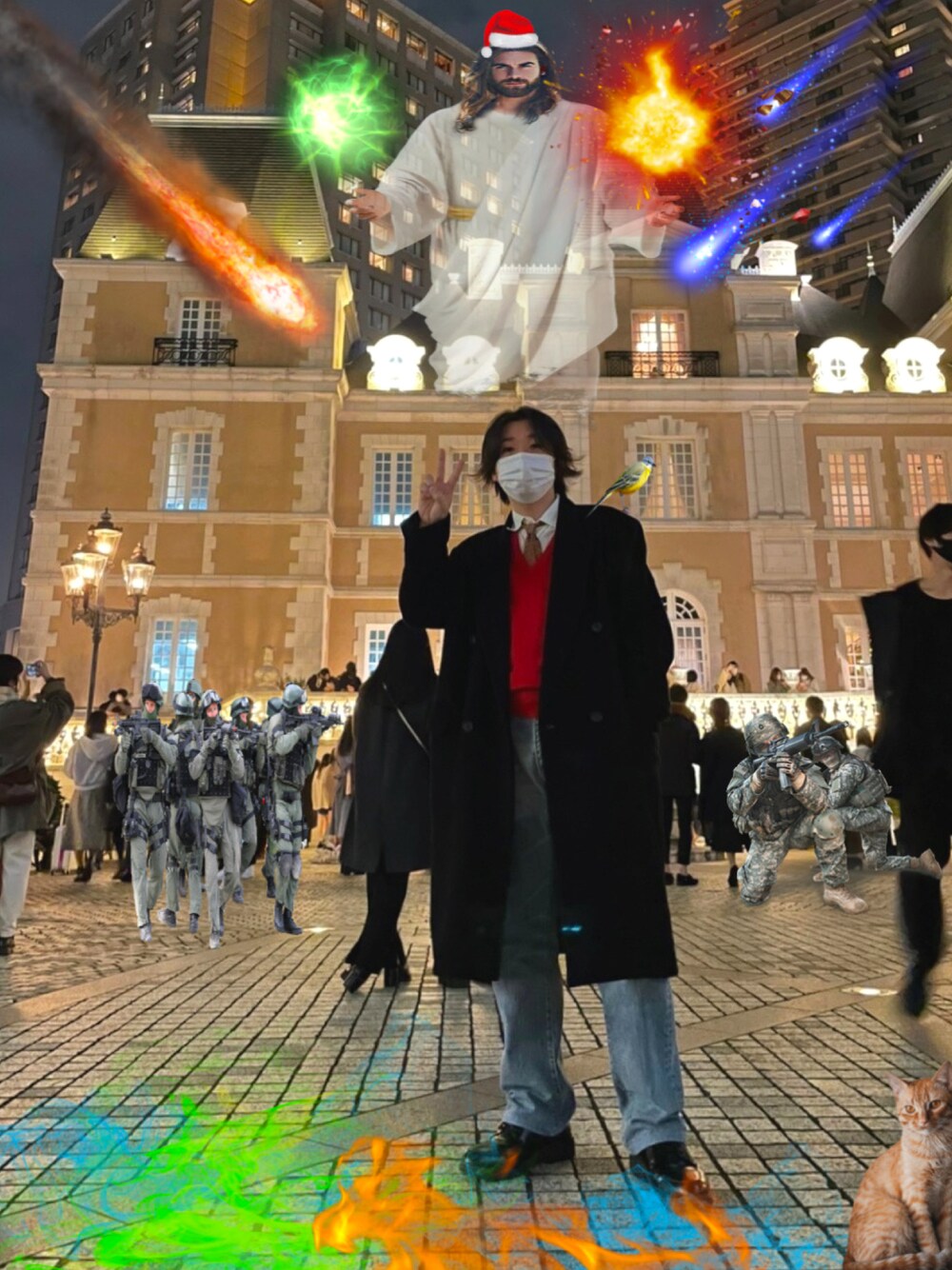 ブラック系のその他アウターを着用したメンズの冬コーディネートの1枚目の写真