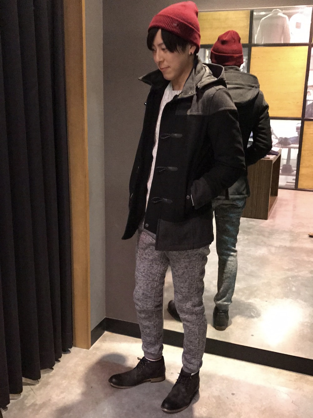 定番ダッフルも大胆な切り返しで新鮮な印象に。ウールライクなパンツとケーブルニットでウォーム感のある着こなし。赤いニット帽で色のアクセントを付けました。