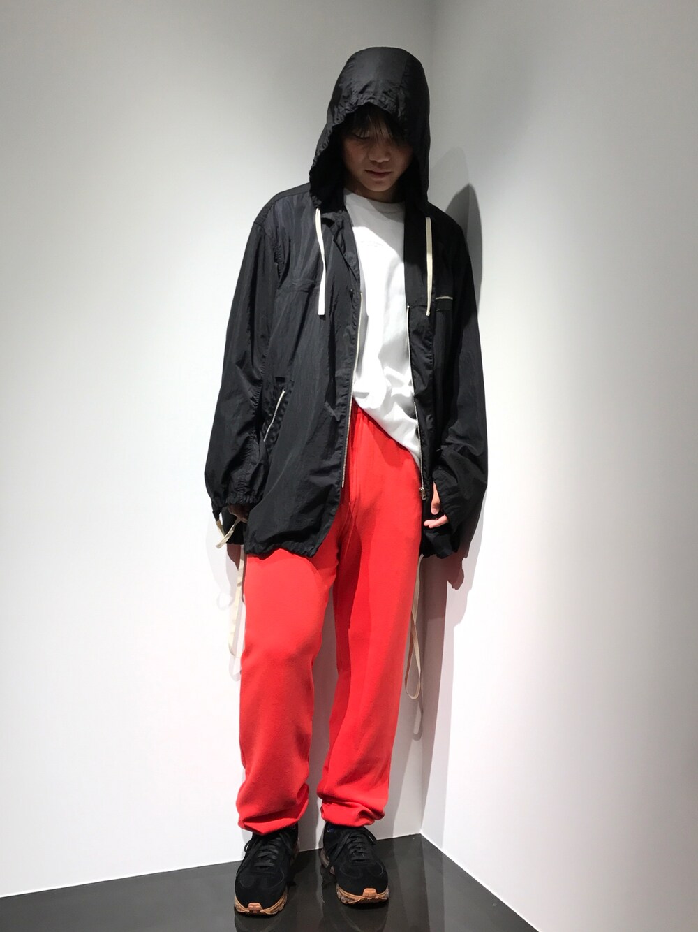 CLAMPのナイロンパーカーが再入荷しました。 ドロールのロゴティーに クラスのスウェット赤パンツが効いてます。 足元はジャーマンのtomo&coでよりスポーティかつミリタリーに。。
