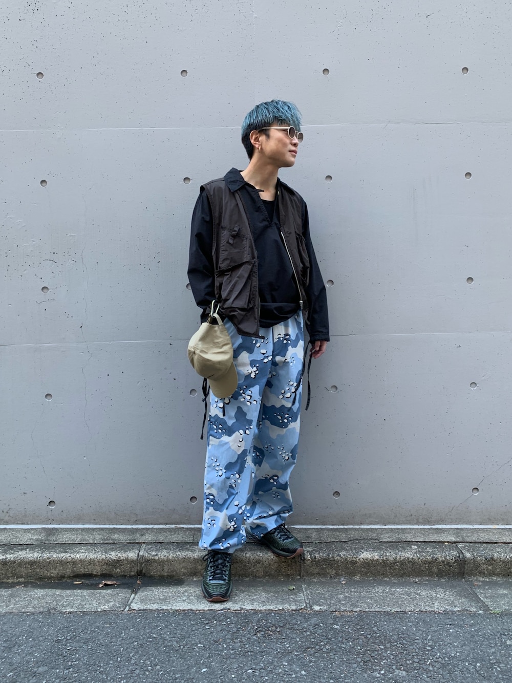 ベストオーバーサイズシャツ柄パンレイヤード チョコチップのデザート柄パンツ VYNER ARTICLES のオーバーサイズシャツの上にCMAIELのオーバーサイズベストをON スニーカーはKIKO ASICS