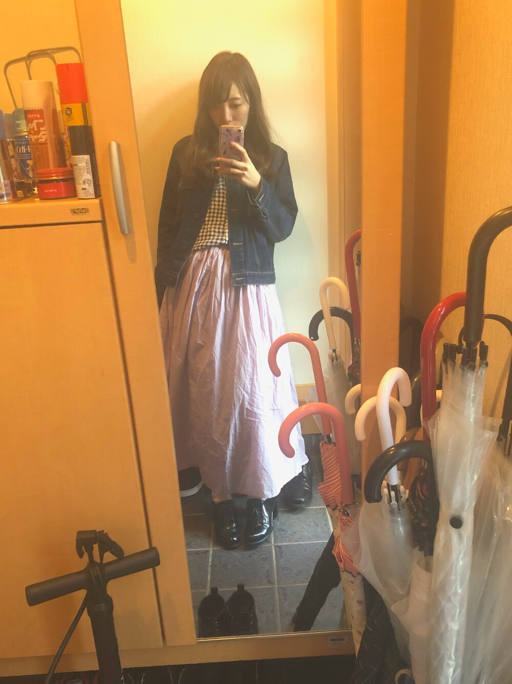 パープルのロングスカートが主役の コーディネート♡ ロングスカートを着るときは トップスの前だけインするのが スタイル良く見えるコツ! ゆるっと感も出るのがよき♬