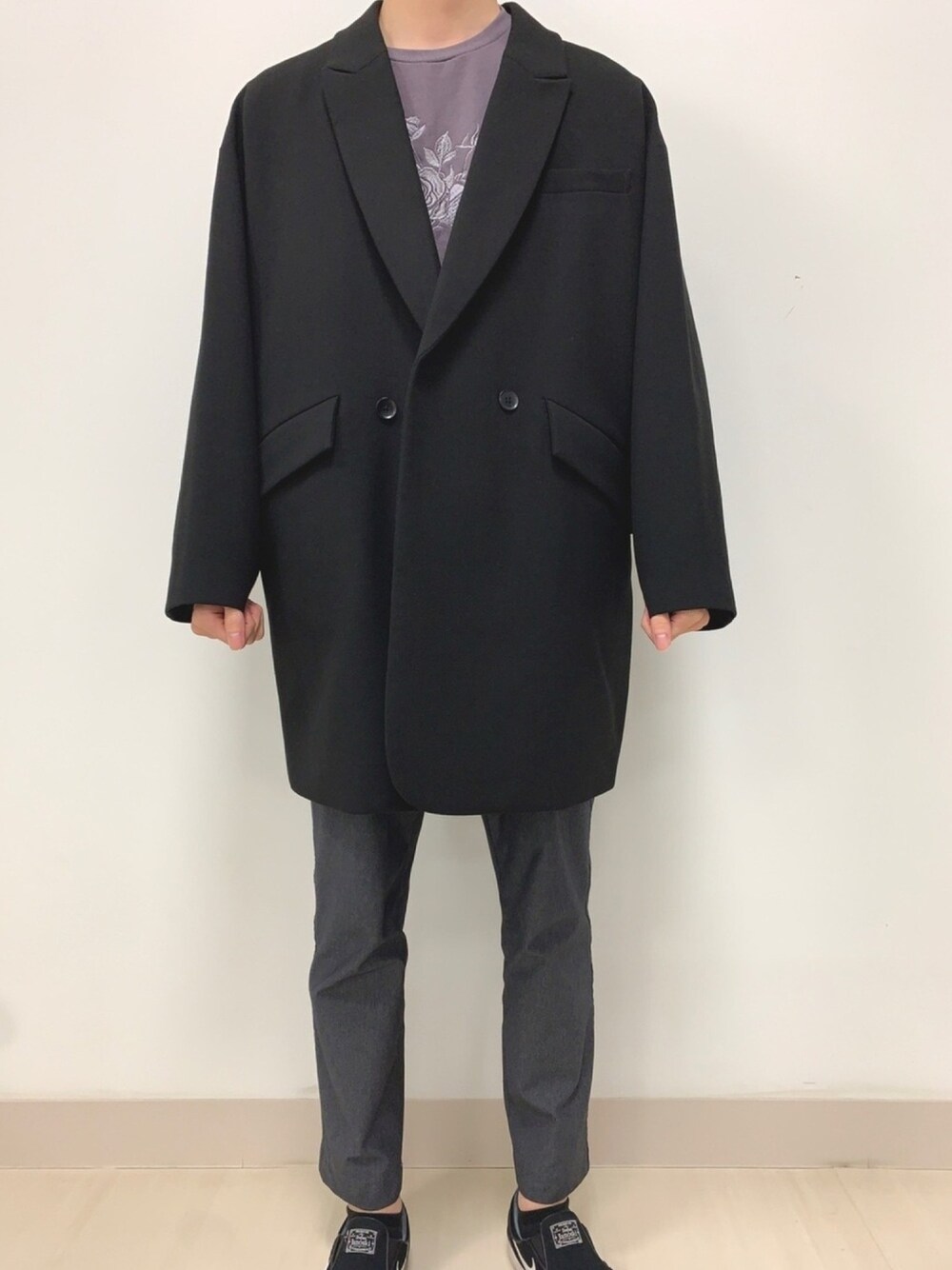 グレー+ブラックコーデです。hareのジャケットコートがビッグシルエットで可愛いです。少し重いのが難点ですが😂生でみるともっとオシャレなアウターなので、写真が上手く撮れるように頑張っていきたいです。花柄の刺繍がチラッと見えるのがポイントです。 いいね、保存、フォローよろしくお願いします!