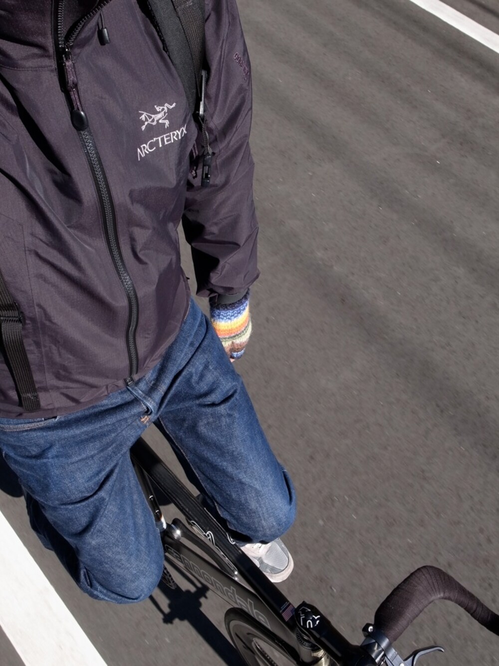 Fine day I'm good! My bike very good! Have a good Sunday! ARC'TERYX と A.P.C. と New Balance と ARTESANIA と 弐号機 ハードシェル:ARC'TERYX β AR デニム:A.P.C. new standard スニーカー:NB 993 グローブ:ARTESANIA 自転車:Cannondale