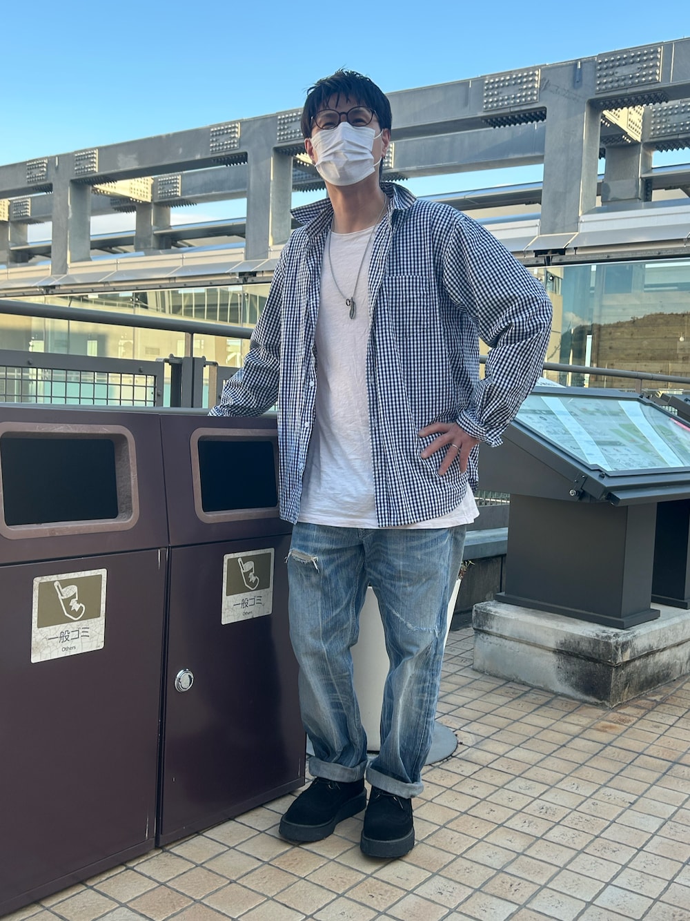 ご覧いただきありがとうございます🥸 今日はいい天気☀️なので、キューズモールに出かけました。そしたら、なんか良くわからんけど軽いノリでゴミ箱と一緒にツーショット📷で、パシャパシャとして見ました。✨🤭 今日はシンプルにギンガムチェック🟦とピンク🩷UNIQLOと黒ラバソールでまとめました。