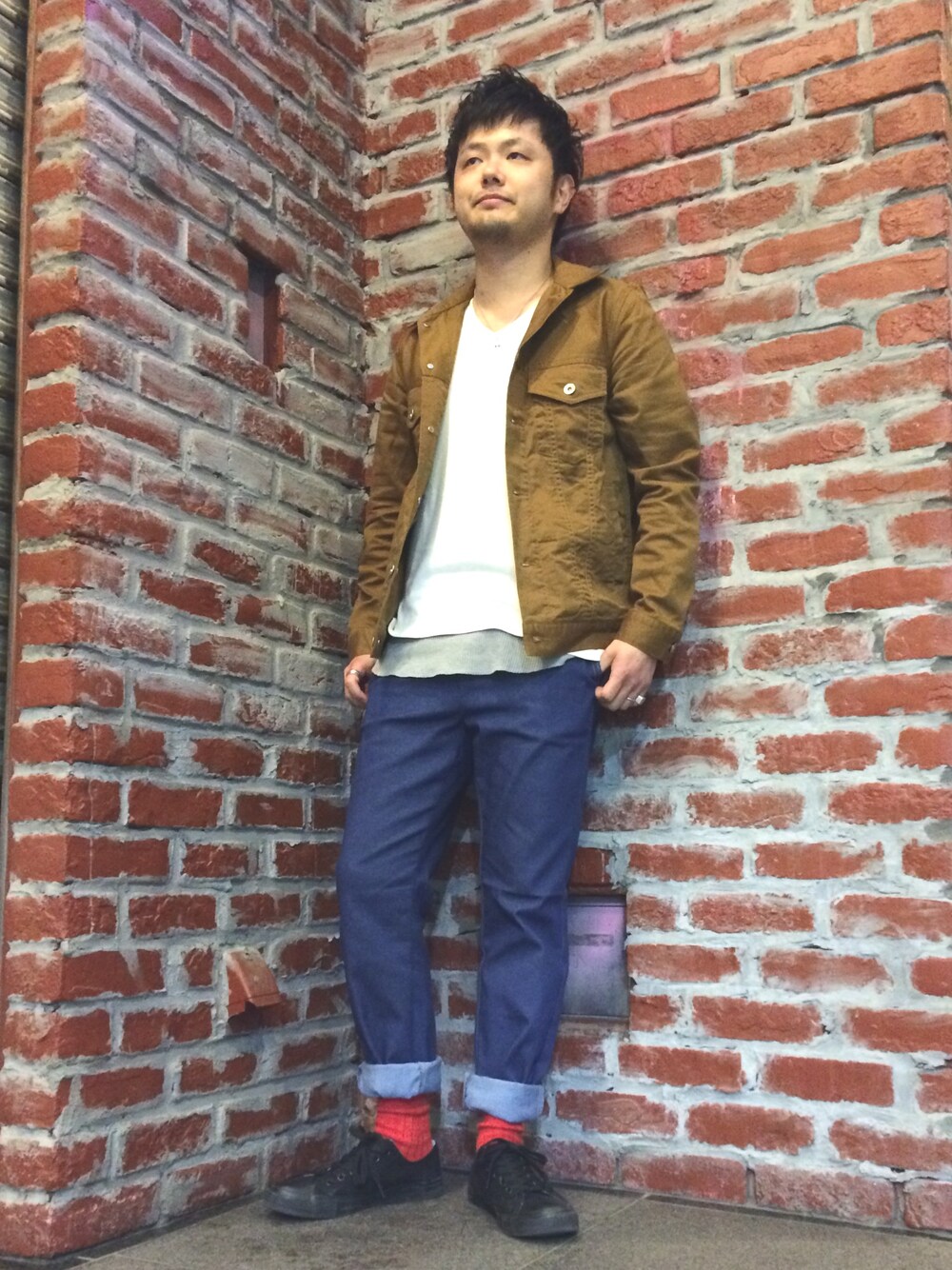 RAGEBLUEのブラウンストレッチデニム!伸縮性あって着やすい! monomartは安くて良品が多いですね〜 !ロールアップで挿し色のレッドソックス!