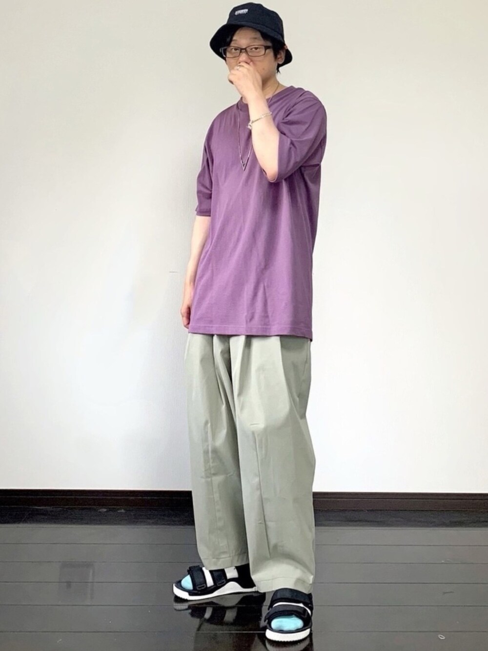 おはようですね🥱 今日も意味無く6時投稿してみた…ヒデです‼️ 昨日は、寝すぎたね…起きたらお昼過ぎてたね…GU行きたかったのに…今日こそ…とりあえず2度寝するけどね🙋🏻♂️ では、 ご観覧ありがとうございます🙇🏻♂️ いつもいいね、お気に入りありがとうございますね‼️コメ下さる方々、ありがとう🥺 ほな…今日のコーデですが… 潔くバケハを被ってみた初コーデですね… バケハ被ったら、顔ださなあかんやんって…こんなポーズになりました…なにか臭ってません‼️ ん?たまに普通に顔出してるやんって?…なにか?🤷♂️ とりあえず、帽子系は基本似合わないとよく言われてたので避けてたのですが…バケハちょっとチャレンジしたくなったみたいです🎩 とりあえず、どんなコーデに合うかなって手探りで今日はこのコーデに… トップスは、くみすパーポで例のあれね…バタフライ刺繍がされてるお気に入りTシャツを…右手でポーズ取れば良かったね…バタフライ見えへんし🤣 ボトムスは、これまたくすんだグリーンのワイドアンクルパンツで合わせた…でもね…アンクル丈あんまり好きじゃないんだ…だから、会えて大きめサイズ買ってゆるっとワイドパンツとして… サンダルは、JAVA‼️TEVAじゃないからね🙋🏻♂️ そんでまたこのソックス履いて色気づきました👍 という…シンプルに🟣🟢⚫️合わせのゆるっとコーデでした… 昨日の投稿、素敵なフォルダインして頂きありがとうございました🙇♂️ ⭐マキマキ氏さん⭐masakazuさん⭐maiちゃん⭐2gkさん⭐N子さん⭐にゃんさん…皆さんありがとう😚 それでは、皆さんごきげんよう、おやすみなさい😪