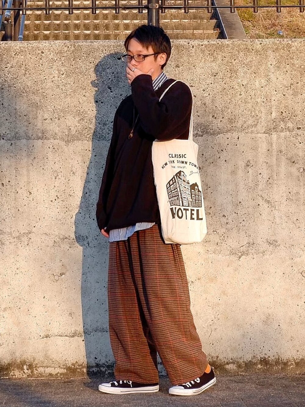 おはようございます😊 いつもご閲覧、いいね、+、ありがとうございます😆お気に入り(+)して頂けると嬉しいです🤩いいね、+、遅くなりますがお返しはさせて頂きますね💁♂️ では… ☆今日のおコーデ☆ ゆるだぼ〜なカジュアルコーデです。 夕日浴びちゃったから…チェックパンツの色味がね…おかしくなっちゃいましたね。🤦♂️まあ、夕日で顔ぼかせれたから、このままってね…🥴 ゆるい黒ニットに青ストライプシャツをレイヤードに…ゆるいチェックパンツを無理やり合わせてみた感じです…💁🏻♂️ はい。 もし今日もこんなので良ければ、いいね、+、フォロ〜よろしくお願い致します🙇🏻♂️ 昨日の投稿、素敵なフォルダインして頂いた方々ありがとうございました🙇♂️