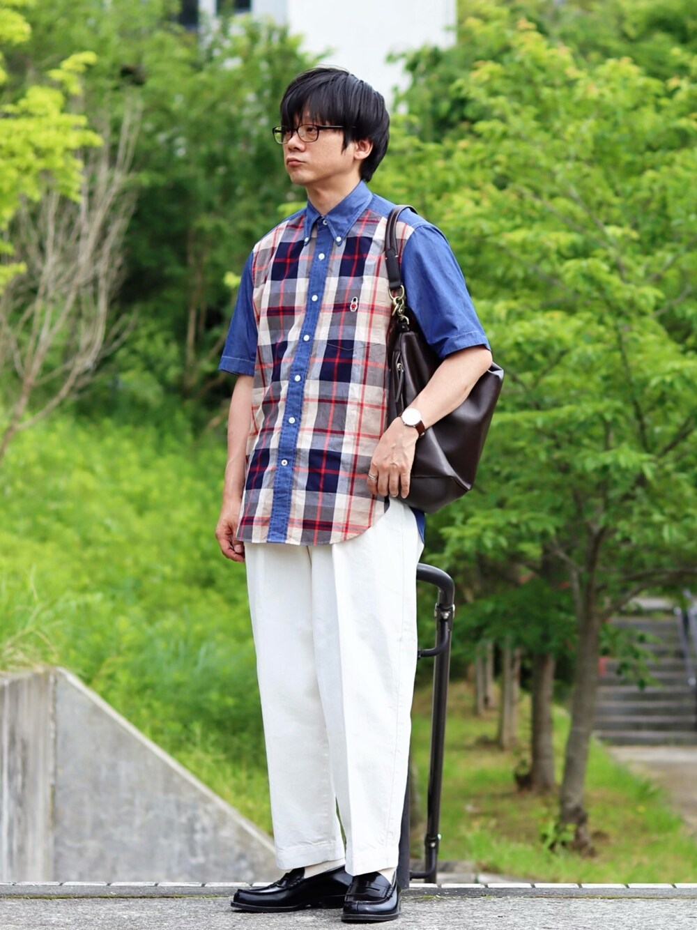 ヒデのシャツ/ブラウス「デニム/タータンチェック 半袖 ボタンダウンシャツ」を使ったコーディネート