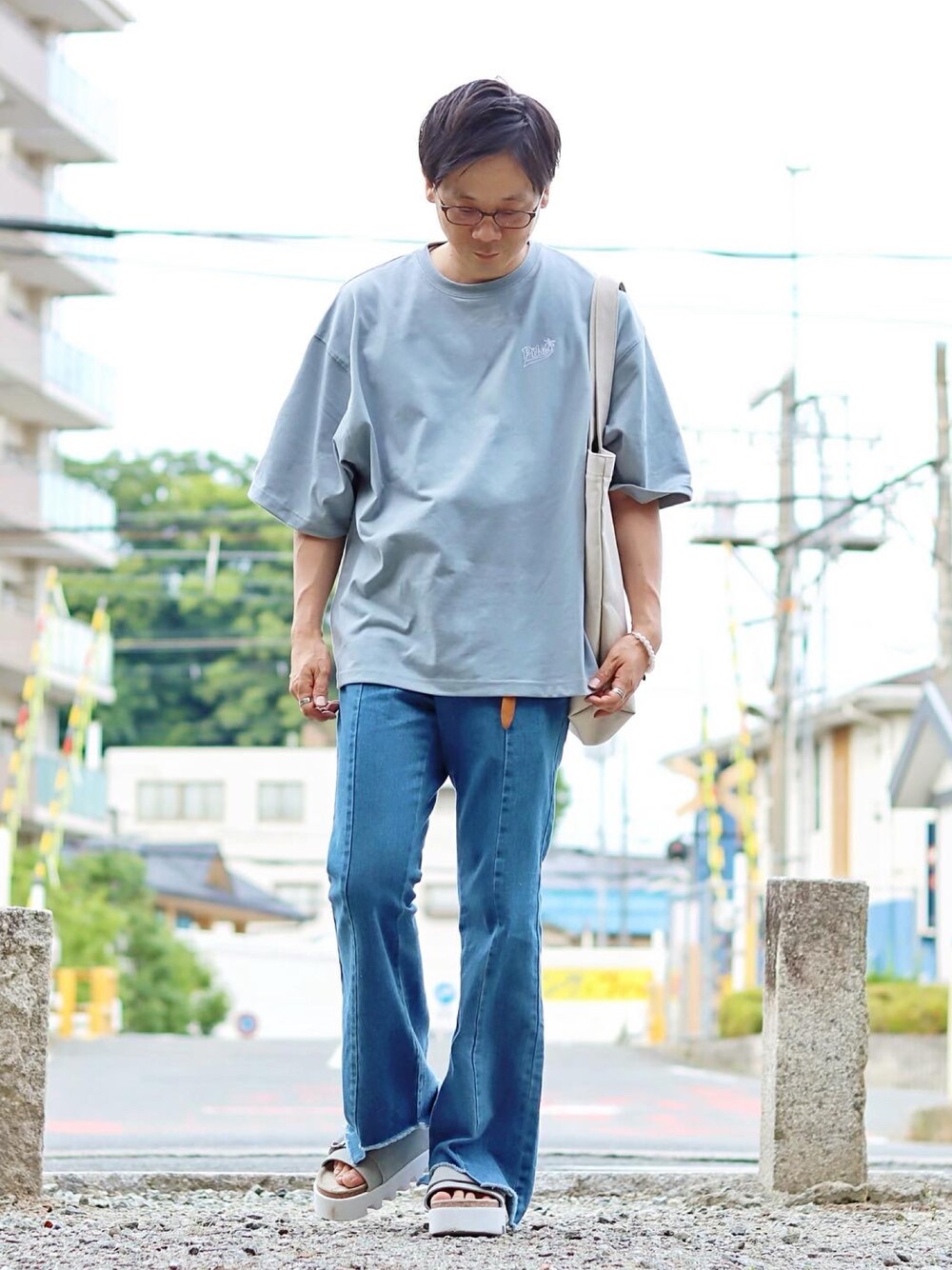 おはようございます。 いつも見て頂きありがとうございます😊 7月もよろしくお願い致します🙇🏻♂️ ☆今日のおコーデ☆ くすみブルーなオーバーサイズTシャツを使った爽やかカジュアルコーデです。 *ZIP FIVEのサーフブランドの【PIKO】の別注ビッグシルエットのエモイラストTシャツ。 古着風で、くすみブルー色味が絶妙です。ゆるっとしたサイズ感がかなりお気に入りですね。 フロントには、PIKOのロゴ、バッグにはエモいプリントが可愛いんですよね…すみません、前向いてて、小窓でご覧下さい🙇🏻♂️ 今回は、ブルーなフレアパンツとくすみブルーな色味の厚底サンダル合わせて、爽やかなに組み合わでね…😊 はい、今日もこんな感じです… ではでは、 今日もこんなので良ければ、いいね、+、フォロ〜よろしくお願い致します🙇🏻♂️ いつもフォルダインして下さる方々、ありがとうございます😊