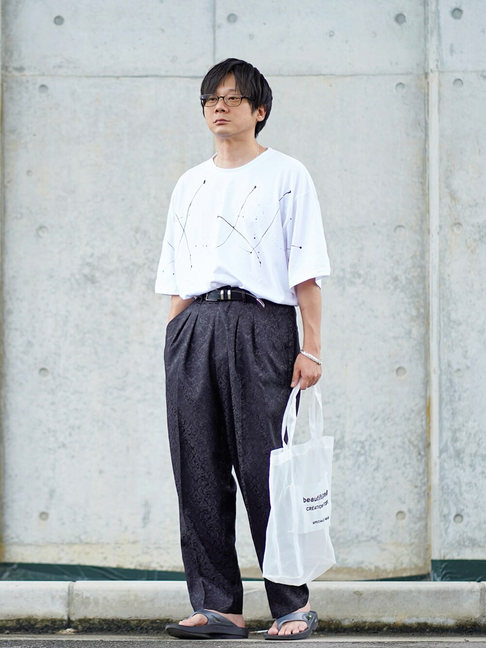 いつも見て頂きありがとうございます😊 トートバッグ…スケスケです。 はい… ☆今日のおコーデ☆ シンプルに白、黒モノトーンコーデです。 CREARE-LINO-のオーバーサイズペイントプリントTシャツと最近お気に入りヘビロテのジャガードな黒スラックス合わせて、タックインしてみました。 ではでは、 今日もこんなので良ければ、いいね、+、フォロ〜よろしくお願い致します🙇🏻♂️ いつもフォルダインして下さる方々、ありがとうございます😊
