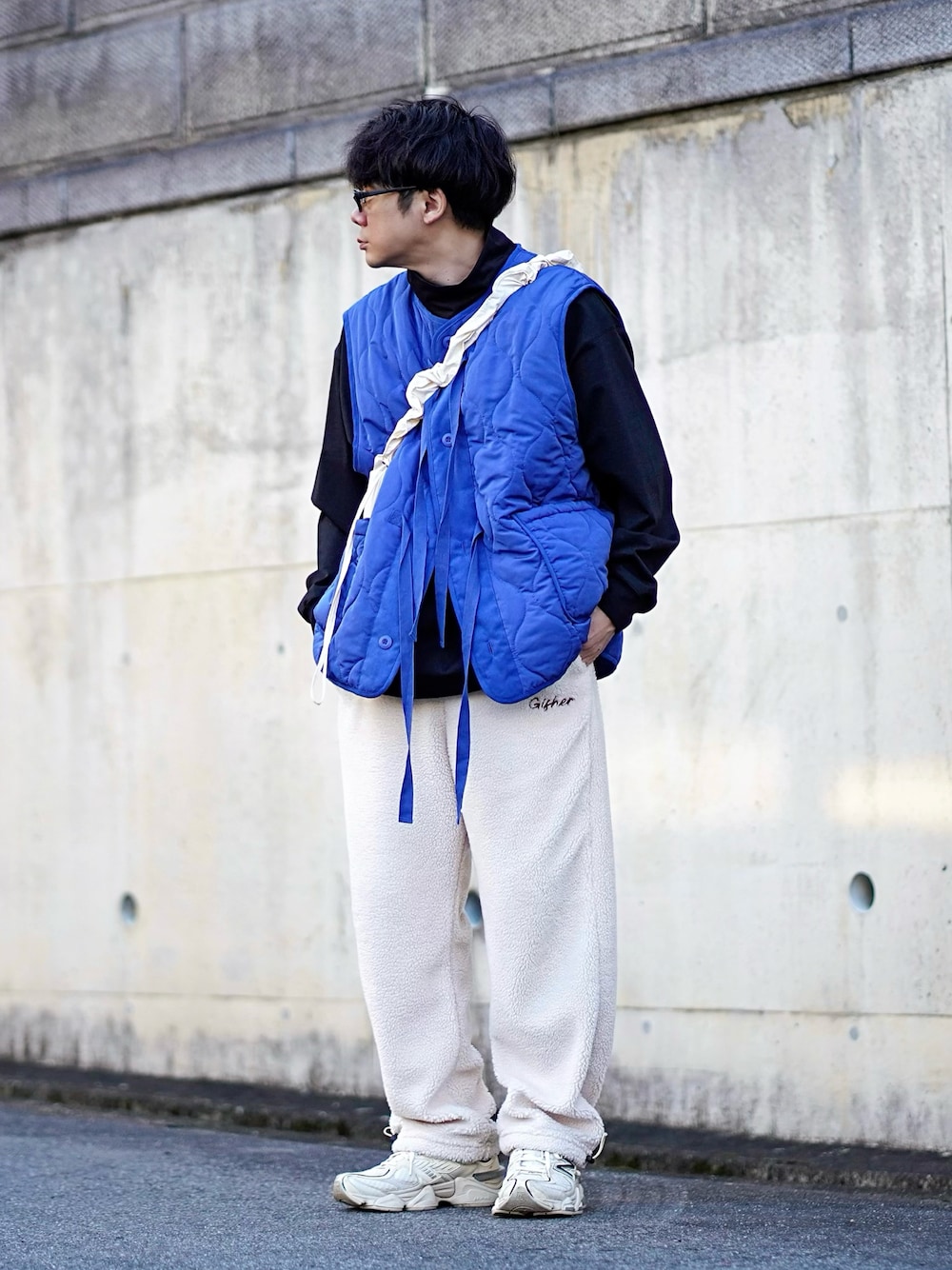 こんにちは🙋🏻♂️ ストリートなコーデん。 GISHERの「BOA FLEECE PANTS」、ボアフリースで暖かいパンツです。裾にドローコード付いて、シルエットも気分で変えれますよ✨ ivoryのMサイズ着用しています。 #PR #GISHER #ストリート