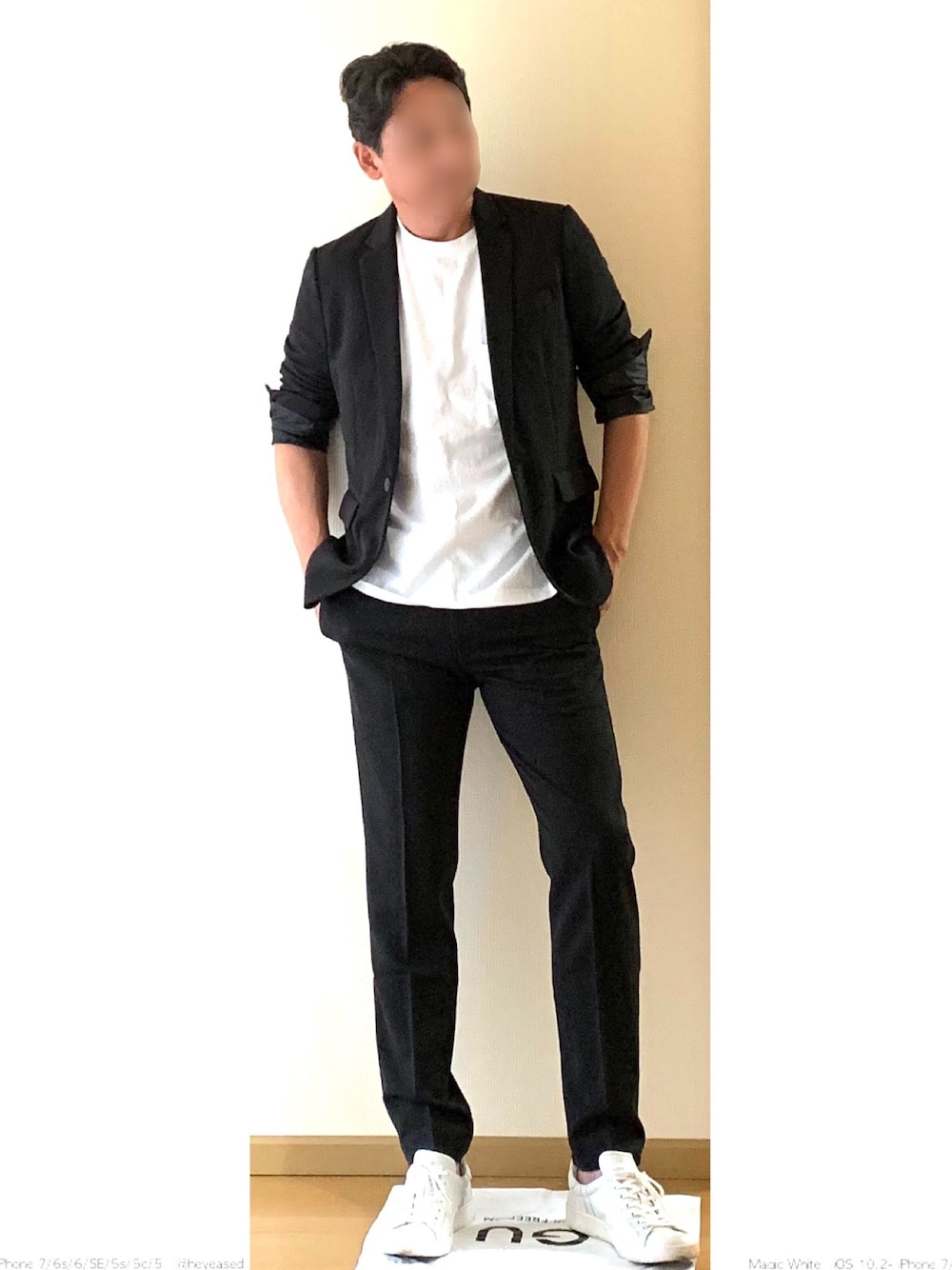 nano・universeのダメリーノというシリーズのセットアップを、商品説明の着こなし風に白Tにして、足元はスニーカーで伊達男を気取ってみた😆 髪の毛跳ねとる😭